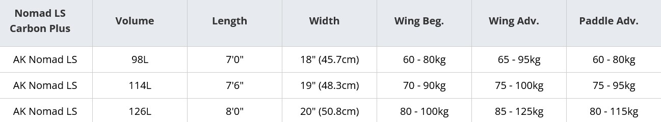 The Nomad LS features a further reduction in width over the original Nomad Carbon Plus. The LS (Light Speed) shape is as slippery as a greased eel, but still versatile enough to downwind, wave ride, or wing in light wind.