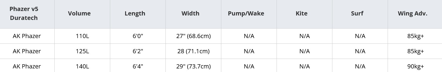 The 110, 125, and 140L Phazer available in the Duratech construction provide a stable platform for light wind winging or the heavier rider. The extremely versatile shape offers a perfect combination of stability and light wind glide, while the curve in the outline creates a manoeuvrable shape that blends predictable performance with maximum playfulness.